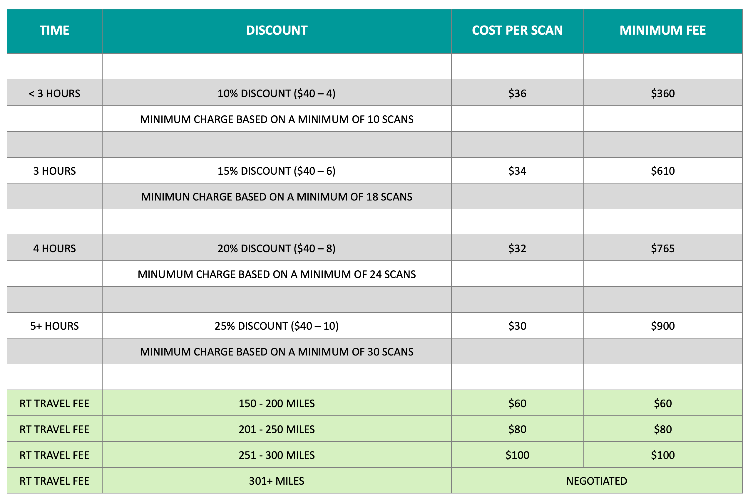 If the minimum number of scans doesn’t occur due to client scheduling or no shows, the Minimum Fee will be charged.